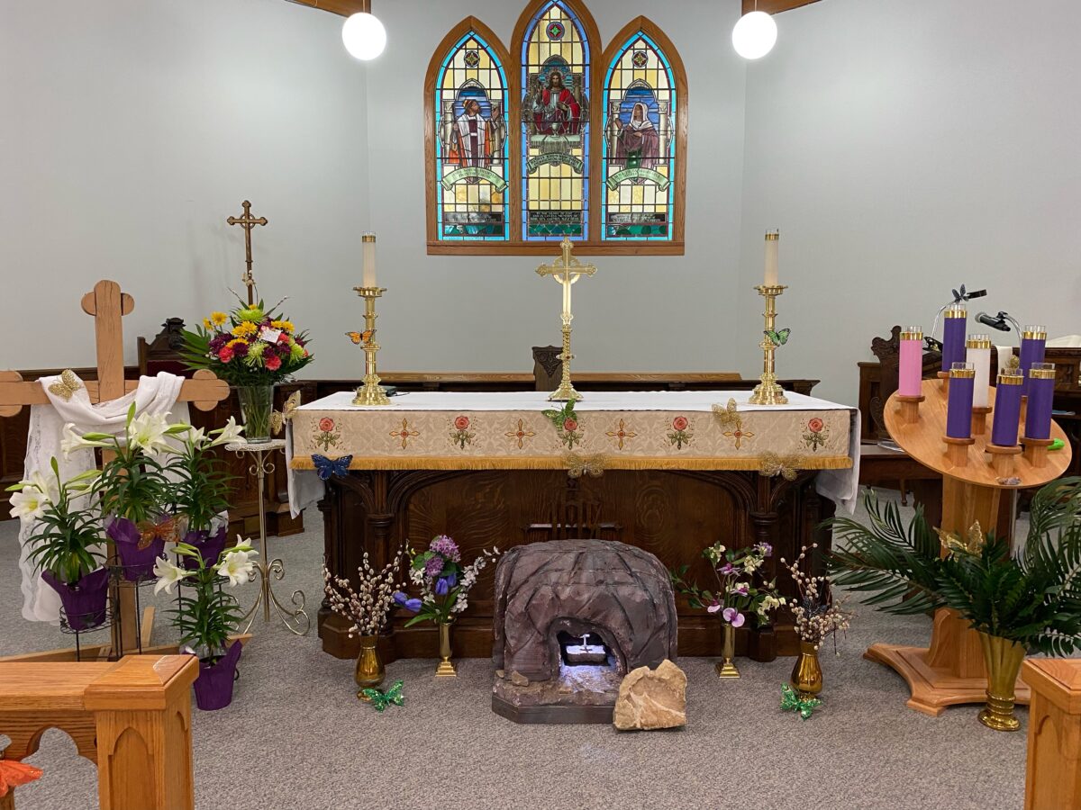 YORKTON (Qu’A) — Symbols of Easter are displayed around the altar at Holy Trinity, Yorkton. The empty tomb with the stone moved away is an