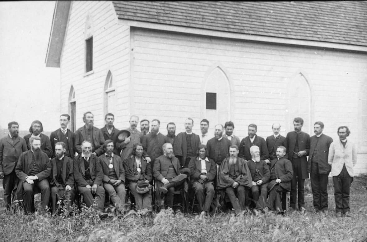 Bishop John McLean (back row, middle) and other clergy and laymen pose in front of St. Mary's, Prince Albert.